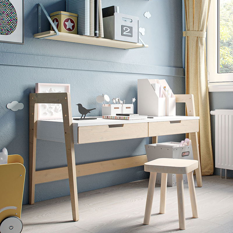 Biurko to bez wątpienia jeden z najważniejszych mebli w pokoju dziecka, spełniający wiele ważnych funkcji. Tutaj maluch lub nastolatek odrabia lekcje, czyta oraz rozwija swoje zainteresowania i umiejętności. Solidne biurko z kolekcji Nature Kid nie tylko świetnie wygląda, ale jest także niezwykle wygodne w użytkowaniu. Produkt wykonany jest w kolorze białym i naturalnym drewnie, co nadaje mu niezwykle estetyczny wygląd.Biurko idealne dla pierwszoklasisty i nie tylko!
