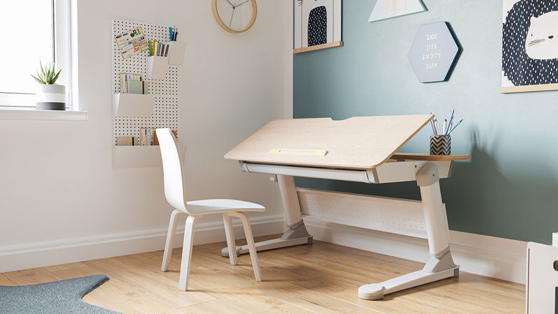 Brzozowy blat tego biurka dla dzieci jest podzielony: z tyłu znajduje się długi element stołu, który pozostaje nieruchomy, natomiast przednią część blatu można odchylać. Odchylanie blatu odbywa się ręcznie, do czego służy wgłębienie na końcu blatu. Sięgaj tam tylko po to, aby odchylić płytę, w przeciwnym razie może dojść do zakleszczenia palców. Zintegrowany system amortyzacji w nożycach zatrzaskowych sprawia, że blat powoli opada po ich uruchomieniu. W ogromnej szufladzie / wewnętrznej przegrodzie można wiele przechowywać. (podobne zdjęcie) -