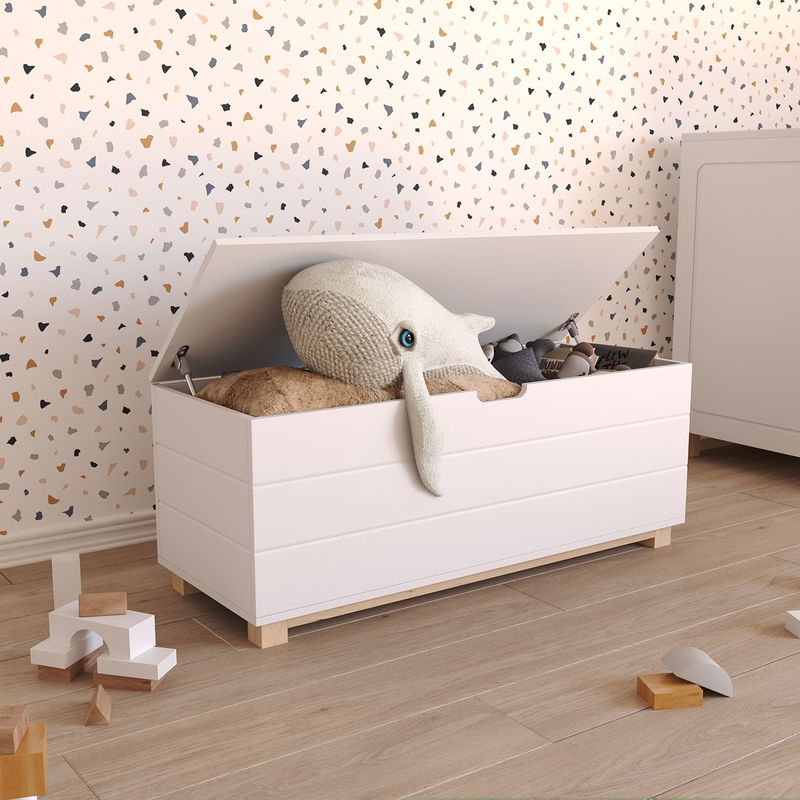- Stabilna skrzynia na zabawki wykonana z płyty MDF i litego drewna sosnowego
