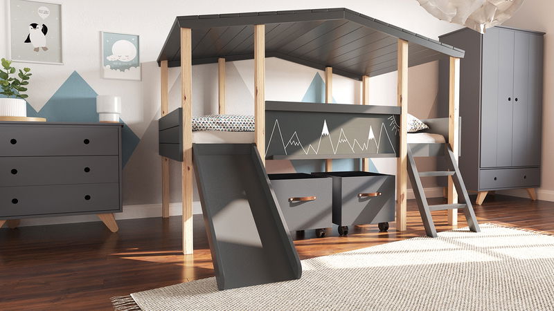 Łóżko domek Cory może być już używane przez maluchów. Łóżko jest niższe niż może się wydawać na zdjęciach i naprawdę pasuje do prawie każdego pokoju dziecięcego. Mocne słupki wykonane z litego drewna sosnowego w połączeniu z najlepszą płytą MDF sprawiają, że łóżko jest bardzo stabilne i trwałe. Kontrast antracytu i drewna oraz wiele otwartych boków sprawia, że łóżko Cory wydaje się przewiewne i lekkie. Pod łóżkiem można również przechowywać wiele rzeczy, na które w innym przypadku nie byłoby miejsca w pokoju dziecięcym.