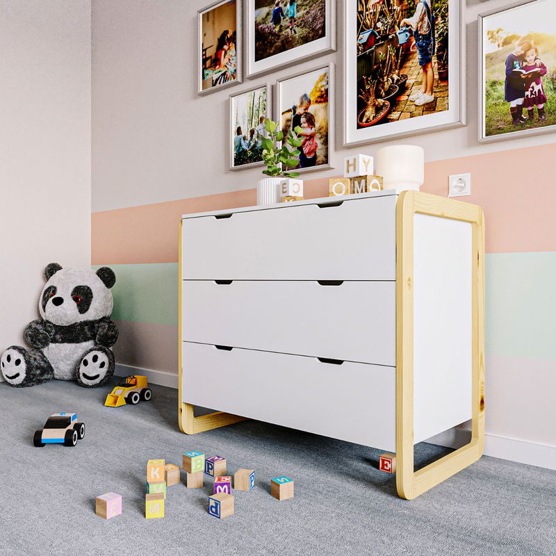 Nasze meble Laslo są absolutnym bestsellerem - teraz możemy zaoferować również pasujące do nich meble. Meble utrzymane są w szykownym zestawieniu kolorystycznym bieli i natury. Komoda Laslo oferuje mnóstwo miejsca do przechowywania w trzech szufladach. Przyciąga wzrok w każdym pomieszczeniu i pasuje nie tylko do pokoju dziecięcego, idealnie sprawdzi się również w przedpokoju czy w salonie. (podobne zdjęcie) -